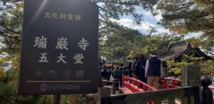 ◇2日目の様子 2日目は松島観光から始まりました。瑞巌寺や五大堂を参拝したあと、それぞれ散策を楽しみ、お土産を買いました。お昼は新富亭で海鮮丼をいただき、フェリーで塩釜まで移動しました。天気にも恵まれ波も落ち着いており、皆気持ち良さそうにしていました。秋保温泉の旅館はとても広く綺麗で、夜には豪華な食事が待っていました。