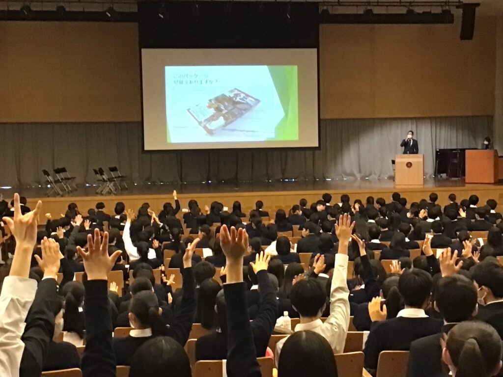 中村氏は1994年の広島アジア大会などの大会で陸上選手としてご活躍後、日立を経て登利平に入社され、現在に至ります。陸上選手だった中村氏が経営者としての今を迎えるまで、どのようなことがあったか。そのキャリアをベースに、生徒の質問に本気で答えてくださいました。立場ならではの振る舞い方の工夫や、結果を出すために努力を継続する大切さ、人付き合いの姿勢まで、中村氏の人柄が表れた素敵な内容でした。生徒たちは今回の講演で気付いたことを自分事に置き換えて行動し、より立派に過ごしていってくれることと思います。