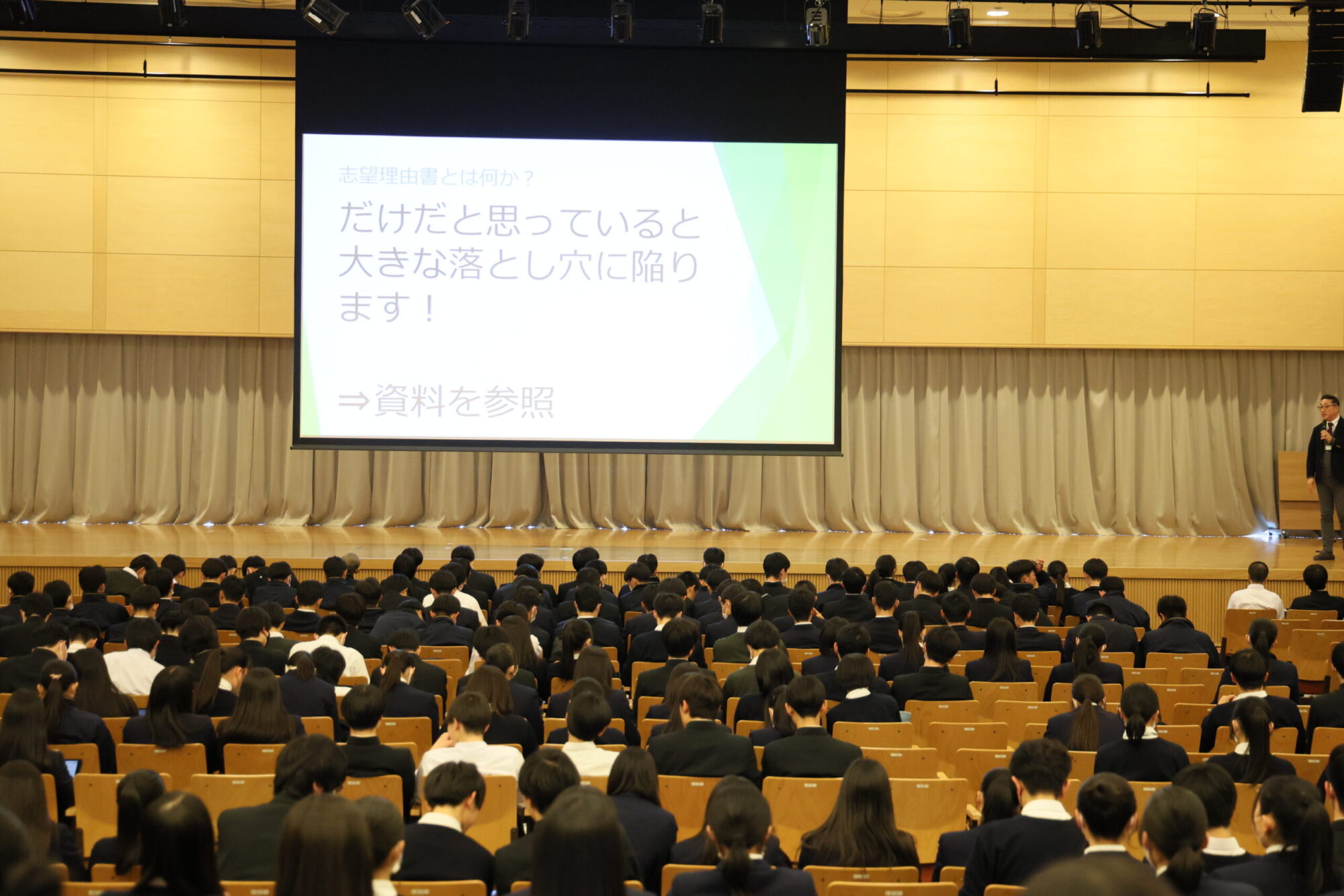 3月18日(月)の放課後に新3年生を対象にした「志望理由書書き方講座」を開催しました。本校国語科教諭の織茂英則先生に「良い志望理由書を書くために」をテーマに、約1時間程度お話していただきました。自分にしか書けない志望理由書を書くためには何が必要か、どんなことを組み込んだら良い志望理由書になるかなど細かく説明をしていただきました。希望者対象の講座でしたが、300名以上の生徒が武揚ホールに集まり、真剣に話を聞いていました。近年、大学入試の学校推薦型・総合選抜型入試のみならず一般入試においても志望理由書を課す大学が増えてきています。来年度、受験生になる2年生にとっては非常に貴重な時間になったと思います。今回の講座で学んだことを進路実現に繋げていってもらいたいと思います。