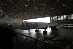 当日は日本航空大学校様のご協力のもと、JALの方々にグランドスタッフの業務見学や格納庫見学をさせていただきました。JALの方々には空港業務の説明をしてもらい、「安全と定時性」のために日々業務にあたっていることを教えてもらいました。