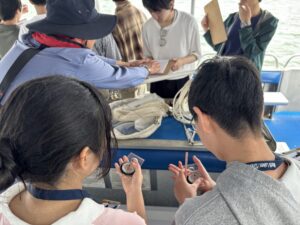海洋保護センターから講師を招いて、ヒトデやナマコ、亀を実際に触りながら、海洋生物の生態について学びました。