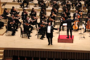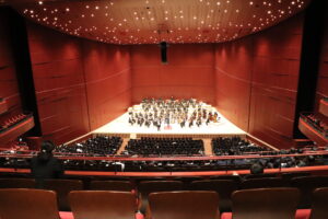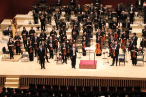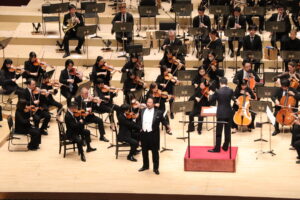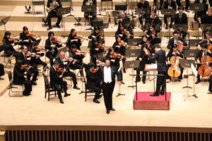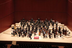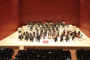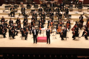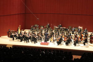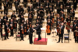 今回の公演は、指揮を松本宗利音(Shurihito Matsumoto)氏が務め、またソリストには本校出身のバリトン歌手今井俊輔(Syunsuke Imai)氏が登場しました。本校の生徒1500人余りが集まり、華やかなオーケストラと力強い歌声に包まれたひとときとなりました。演奏だけでなく、指揮の松本さんとバリトン歌手今井さんの曲の解説を含めた楽しいおしゃべりややりとりから、音楽により親しみを感じられる演奏会となりました。