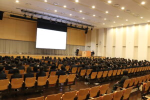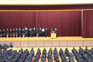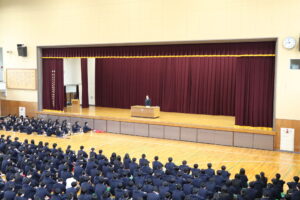 1月7日(水)の1時間目に、本校体育館メインアリーナにおいて3学期始業式が行われました。校歌斉唱に続き、校長先生からは、「自己省察」のお話がありました。自分の行動や考えを客観的に振り返ることを習慣化することで、自身の成長や課題が明確になり、それが次のステップへの確かな指針になるという力強いメッセージが送られました。その後には表彰伝達が行われ、活躍した生徒たちの功績に対し、全校生徒から温かく盛大な拍手が送られました。