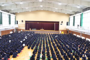 4月7日(火)に令和8年度始業式が本校体育館メインアリーナで行われました。中等部2年生、3年生、高校2、3年生が一同に集い、始業式を実施しました。吹奏楽部の演奏による校歌斉唱に続き、校長から挨拶と生徒に向けたお話がありました。その後、新任式が行われ4月に赴任された先生方の紹介とご挨拶がありました。