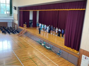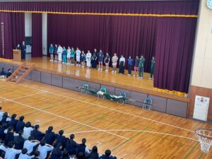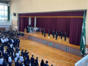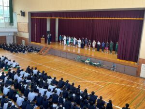 生徒会本部役員生徒の進行の下、教頭先生や生徒会長の激励の言葉の後、各クラブのキャプテンや部長が大会の目標や抱負を述べました。