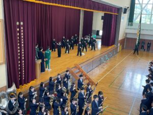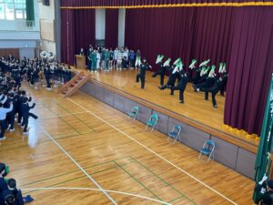 その後、応援団のリーダー、吹奏楽部の演奏に合わせて校歌や応援歌、青山ほとりによりエールを送りました。日頃の練習の成果を思う存分発揮し、ベストを尽くして大会に臨んでもらいたいです。