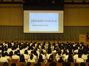 平成29年9月29日(金)、本校武揚ホールにおいて、1学年Ⅱコースの総合学習の取り組みとしてビブリオバトルを開催しました。 各クラスの代表者が集い,一人5分の持ち時間を使って一冊の本を紹介するプレゼンテーションを行いました。それぞれのプレゼンテーションを聞き、「どの本を一番読みたいと思ったか」という視点にもとづき投票を行いました。